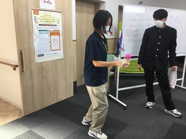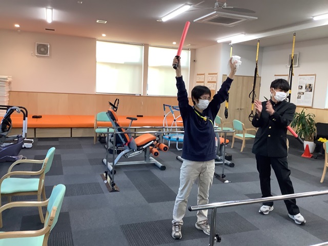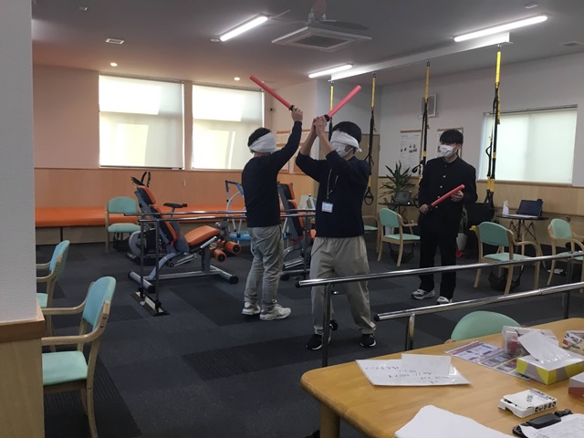 次に、第2回目隠し剣道では、タオルで目隠しをした職員が棒を振り、先に相手の身体に当てた方が勝ちというゲームです。相手の場所が分からず戸惑う職員の動きに利用者様も大笑いし楽しまれておりました。