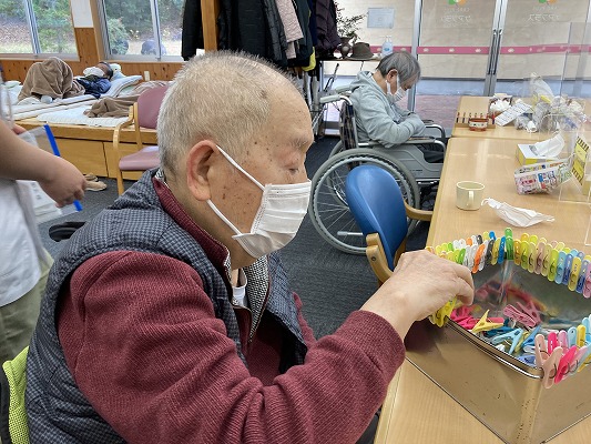 洗濯ピンを缶の周りに挟んでいく手のリハビリをされているところですね。