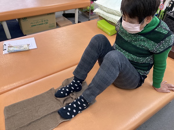 タオルを使用したタオルギャザーで足指の運動行い歩行能力の向上。