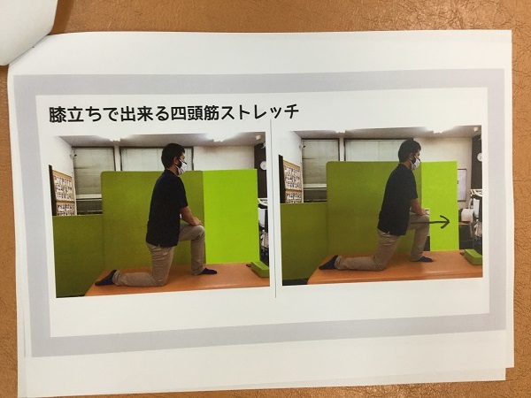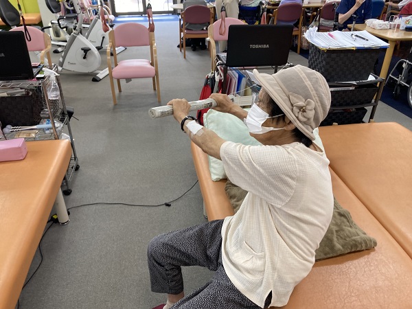 例えばリハ職員が数種類の運動を組み合わせたメニューを組みご自宅での運動時に見ながら取り組めるように資料をお渡しし、その後ご自宅にて実践しての感想など聞き取りを行い負荷調整し無理なく続けやすいようサポートしています。