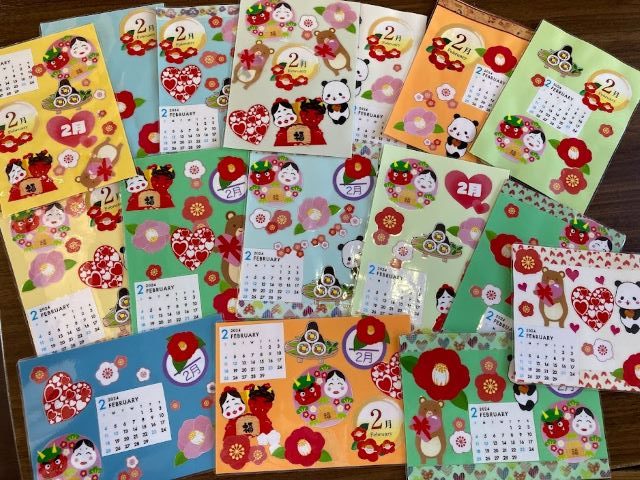 ミニカレンダー作成は2月用のカレンダーですので、椿の花や梅の花、バレンタインをイメージしたイラストを沢山貼り付けていただきました。