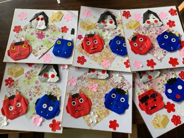 なんだかかわいい表情の鬼の色紙が出来上がりましたね。ひょうきんな表情の鬼もいます。