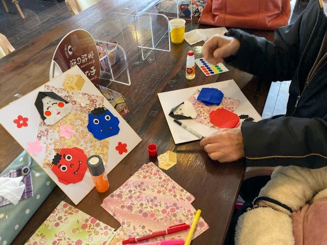 皆様、お好きな配置に鬼やお多福、梅の花を貼り付け、マジックでお顔を描いていただきました。