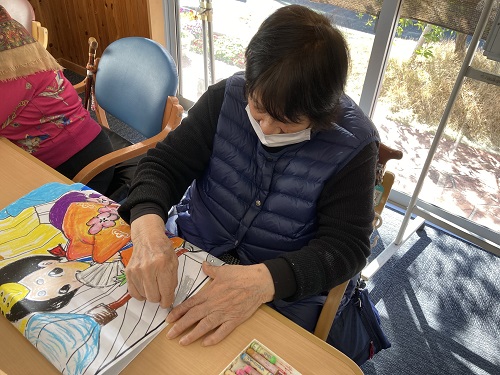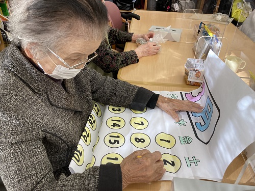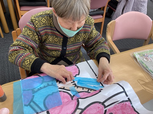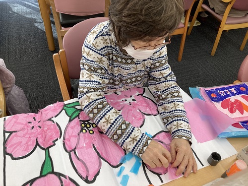 「もうすぐ春がやってくるね!」「孫にひな人形を買ってあげたんよ!」等お話ししながら、作成して頂いております。
