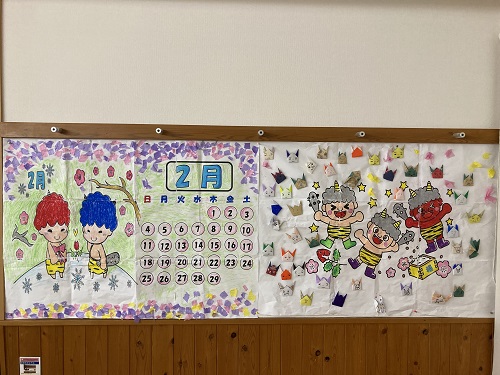 皆さんがそれぞれ作成した鬼の顔がにぎやかに散りばめられ、素晴らしい作品になりました。