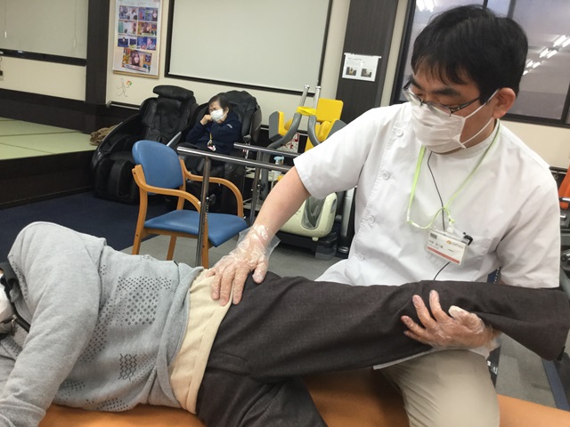 どうしても高齢になると身体が弱り筋肉も衰えてきます。ちょうどお尻の部分は骨に圧迫され痛みを感じることがあります。そこで、痛みの軽減を図るため筋肉の柔軟性向上・筋力強化を目的にリハビリに取り組んでいただきました。