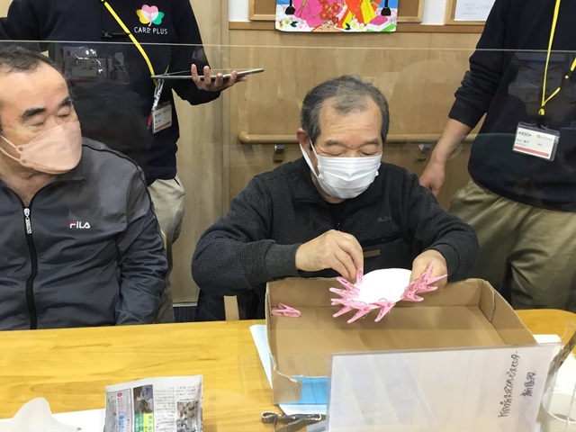 「外す方は楽やけど付けるのは大変」「洗濯バサミは指先に良いリハビリになる」とおっしゃられながらチームで協力し皆様楽しんでおられました。