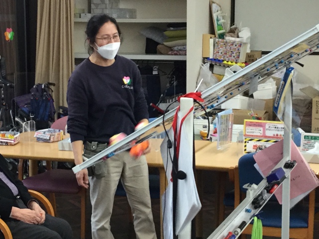「斜めやけん落ちてくるな〜。難しい。」と言われながらも一生懸命行われておりました。上手に乗ると真剣な表情にも笑顔がみられます。「難しいけど楽しいわ!」と喜んでいただく事ができました。