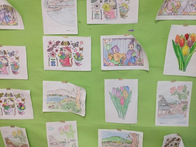 ご利用者様のご様子としては、リハビリや入浴を待っていただく間、塗り絵や脳トレプリントをされている方が多いです。毎月開催している塗り絵コンテストでの入賞を狙い、皆様丁寧に1枚1枚塗られています。