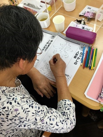 塗り絵の他にも脳トレや点繋ぎのプリントをご用意しており、一日かけて完成させる方、持ち帰ってご自宅で取り組まれる方と様々です。