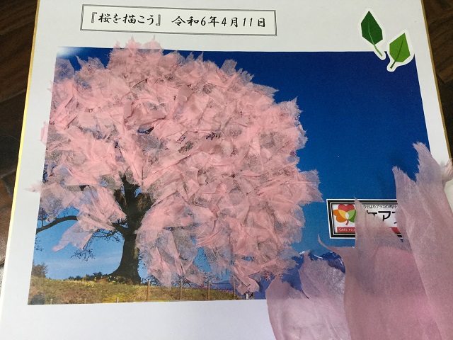 手の不自由な方は職員と協力して、どこにどのように貼るか相談し合いながら完成させる事ができました。最初は苦戦したものの出来上がると綺麗に桜の花が咲き、近くの方と出来上がった作品を見せ合いながら、お話にも花が咲いていましたよ。