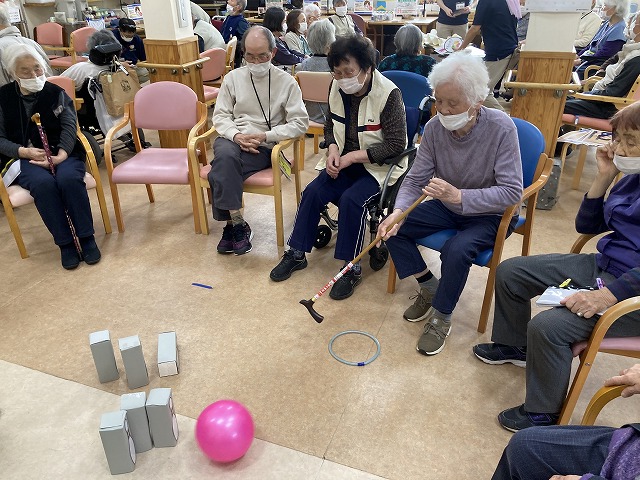 次にスカッとボーリングでは、杖でボールを叩いていただきピンを倒していきます。