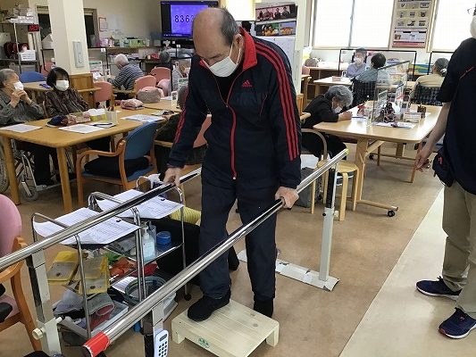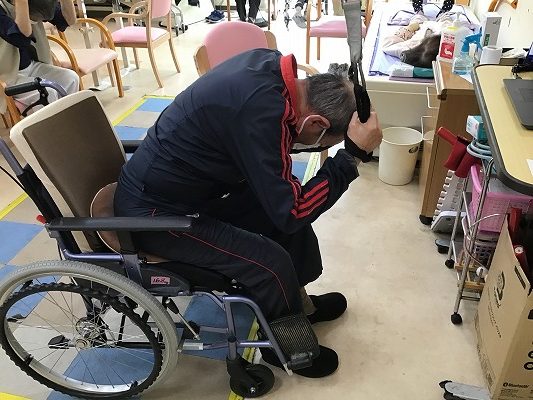 Nさんは車椅子で来所されており、手指の動きにくさと下肢の動作不安定がみられています。入所されている施設でも短距離なら手すりを使用して歩けるということだったので、