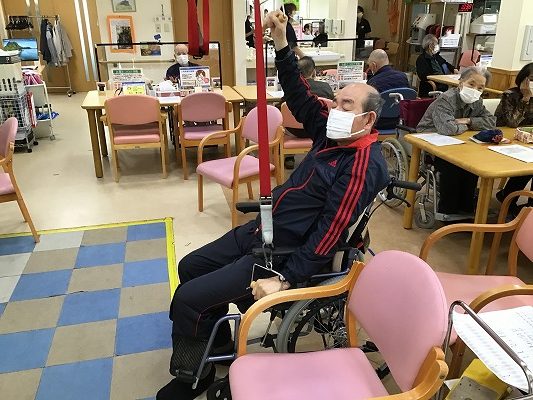 またオールタイムリハビリとして、お席に着かれている際にもハンドグリップやセラバンドを使用しトレーニングを行われ、入浴時にも着替えなどご自分でできる事はしっかりと行っていただいています。