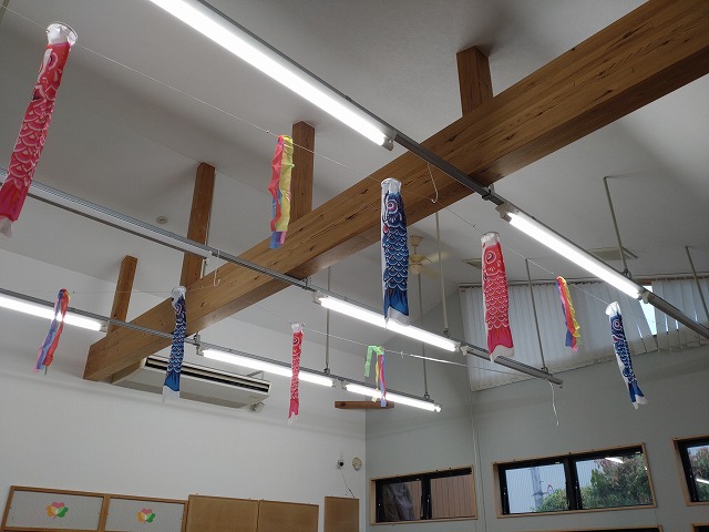 外から入ってくる風により、こいのぼりの歌にあるように面白そうに泳いでおります。