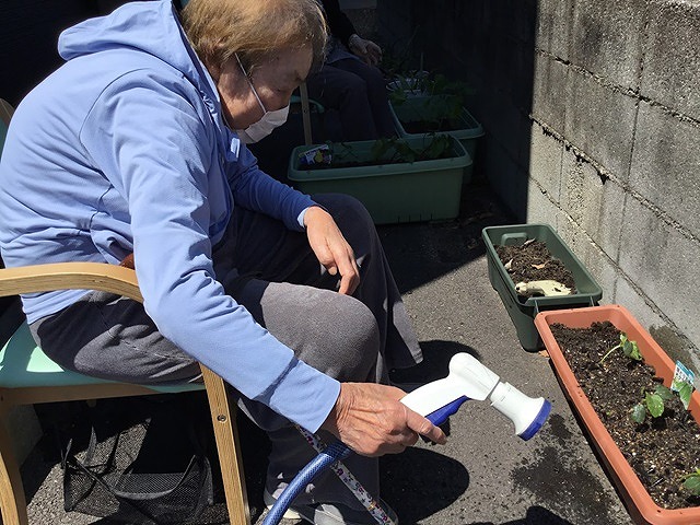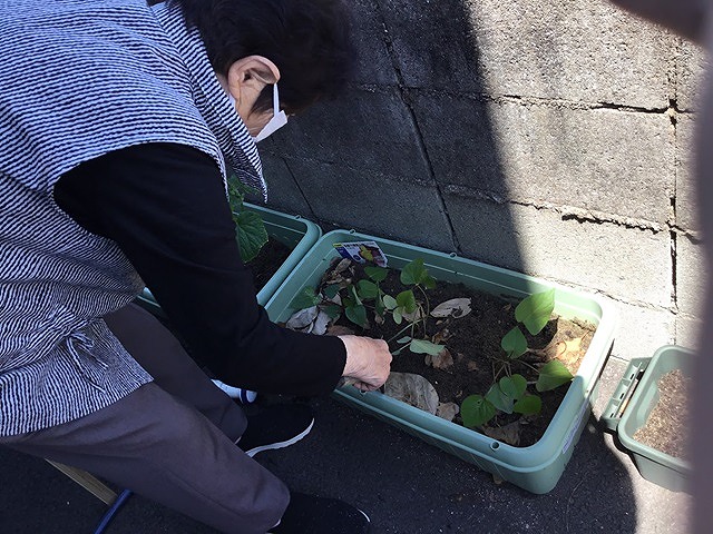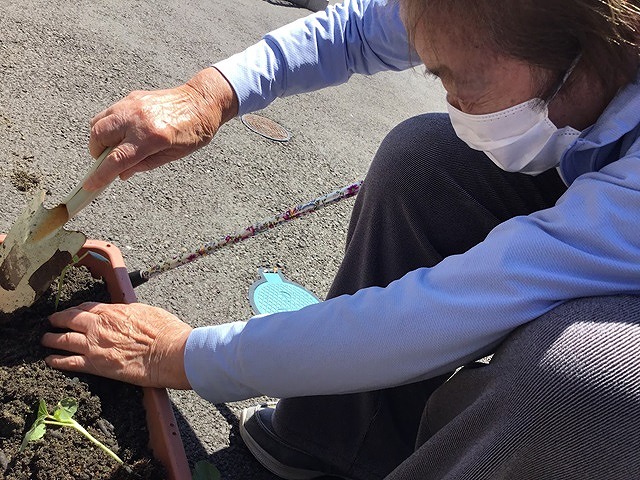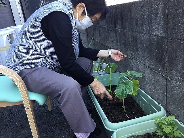 続いて今年の夏野菜を植えました。トマト・サツマイモ・ズッキーニ、小松菜、おくら、きゅうりの6種類の野菜を利用者様と植えました。