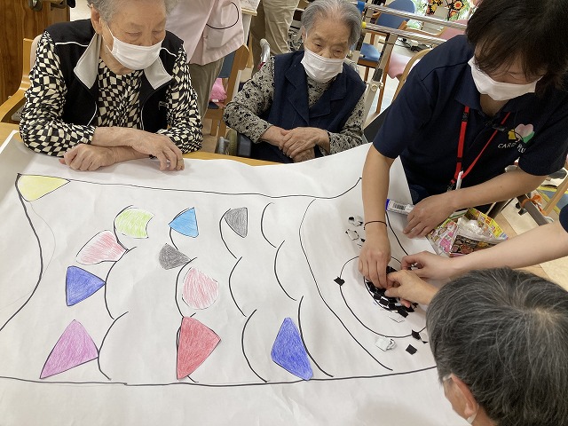 体もほぐれたところで、先日塗っていただいたこいのぼりのうろこ貼り!