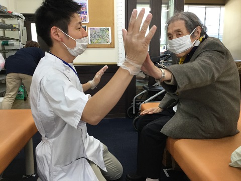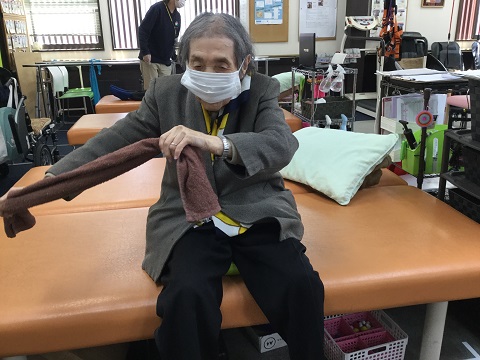 まず始めに座位姿勢の安定性向上を図る為、座った状態でご利用者様が手を伸ばし、私の手にタッチしていただく動作を繰り返し行い、体幹のバランス能力向上の訓練を行いました。