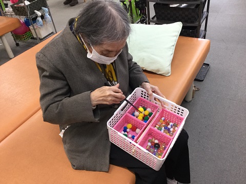 最後に、食事動作がスムーズに行える様に箸でビー玉や綿のボールを左右に移動させる手指の巧緻運動訓練を行いました。