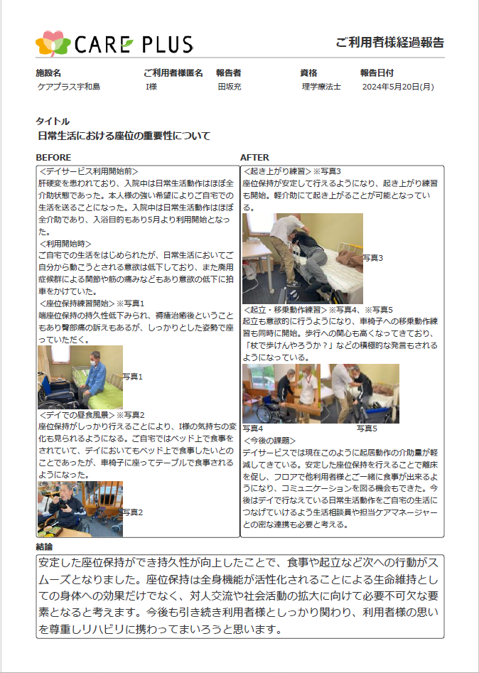 6月号のリハビリNEWSは、安定した座位保持ができ持久性が向上したことで、食事や起立など次への行動がスムーズとなった症例となります。座位保持は全身機能が活性化されることによる生命維持としての身体への効果だけでなく、対人交流や社会活動の拡大に向けて必要不可欠な要素となると考えます。
