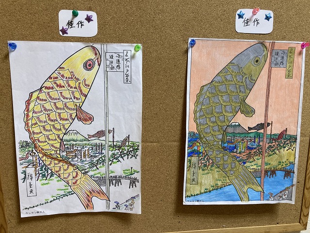 明るい色合いと、豪華金銀の鯉のぼりですね。皆様、綺麗に塗ってくださいました。