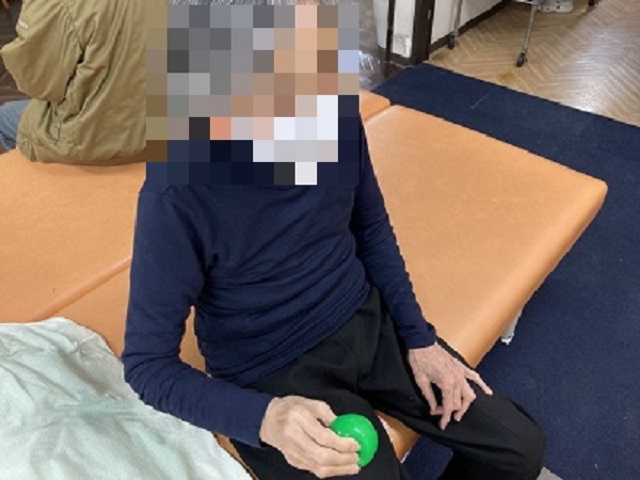 そこで、筋力維持し痛みの再発防止のためにゴムボールを使用した運動を無理のない範囲でご自宅でも実施していただきました。