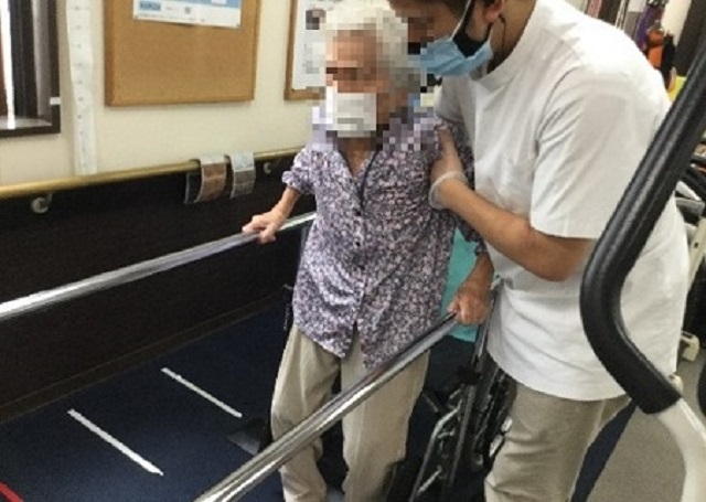 リハビリの様子ですが、術後の影響から膝関節に疼痛・可動域制限・筋力低下等が出現しており、最初は平行棒内を介助にて歩行していました。