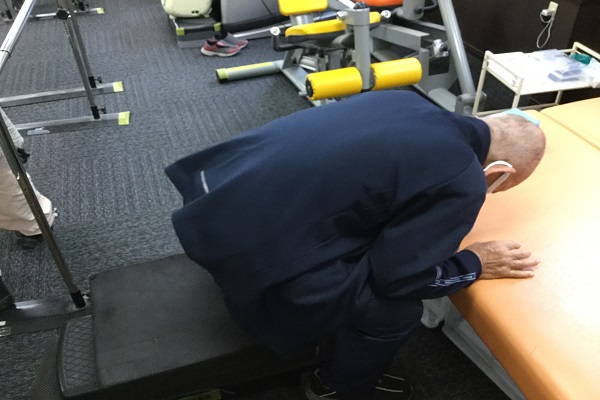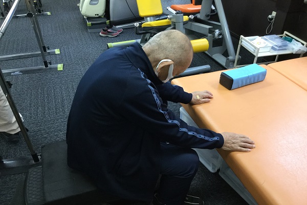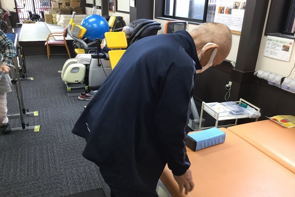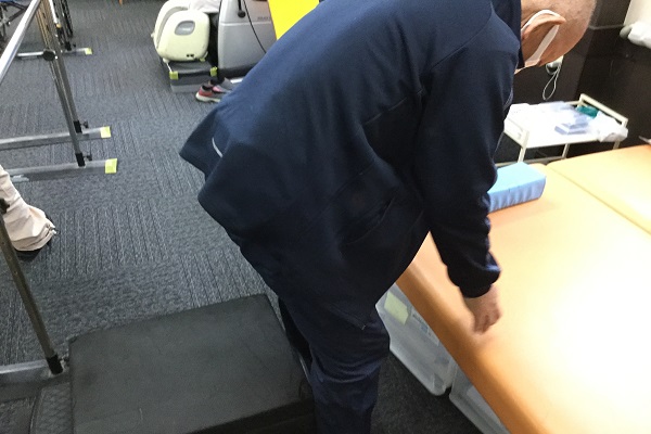 そこで、デイでのリハビリでは機器を用いた自主訓練のほかに、実際の作業を想定した立ち上がり動作を取り入れ、反復して実施していきました。