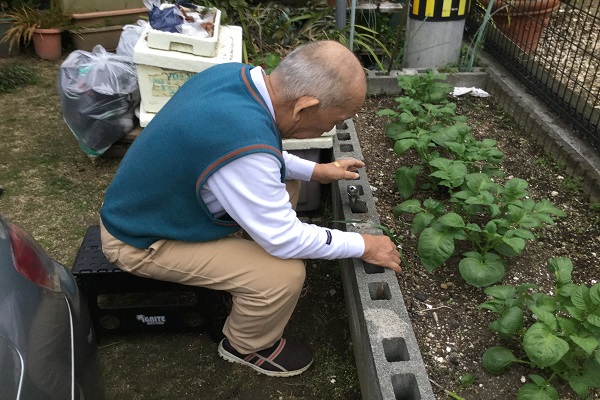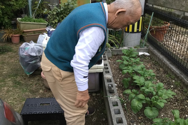 最近、家の近くの植え込みでジャガイモの植え付けを行ったとのことで、今度は摘果(※)作業を行うとのことでした。そこで、その様子を改めて拝見させていただきました。