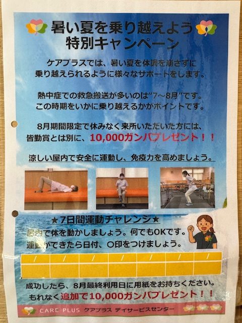 そんな中、ケアプラスでは暑い夏を乗り切るために利用者様応援キャンペーンは8月に開催しています。この暑い夏はご存知の通り、熱中症や夏バテが頻発する季節です。暑さにより、外出することが億劫になった経験はみなさんあるでしょう?