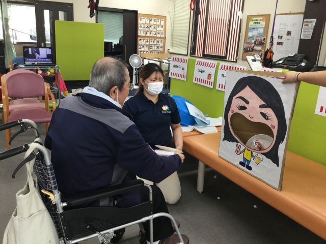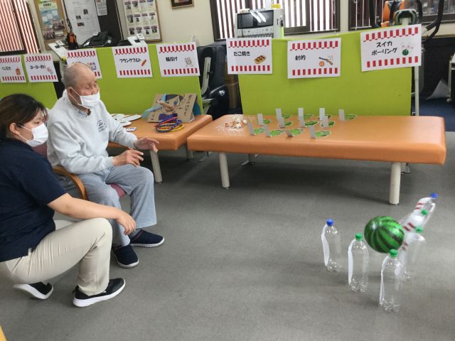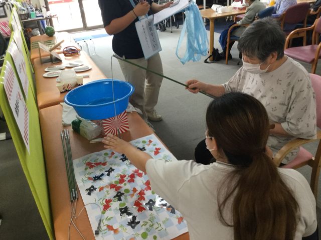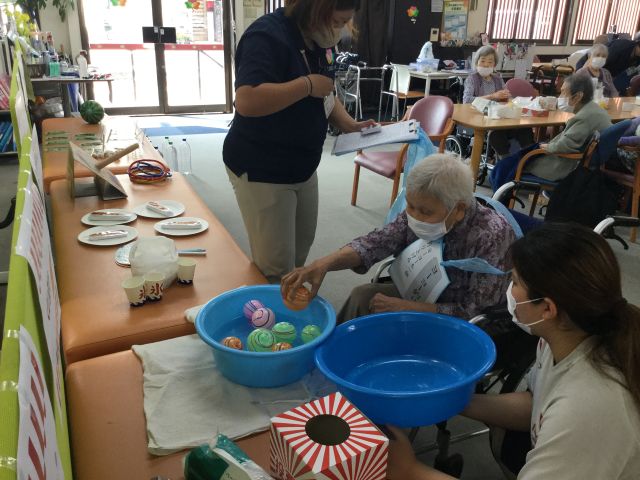 チームごとの対戦方式で、まずはミニゲームに挑戦します。3チームに分かれ、どのゲームに挑戦するかカードを引き、選択したミニゲームを早くクリアした順にポイントが加算されていきます。チーム全員の合計得点で二部の脳トレ問題を選択できる。という流れです。今回は『涼』を感じるミニゲームを9種類準備し、金魚すくい、ヨーヨー釣り、団扇で紙コップの中に丸めたティッシュを入れて作るかき氷、フランクフルトフリスビーなどを楽しんでいただきました。