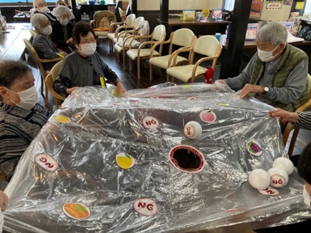『秋の大収穫』は利用者の皆様が力を会わせて秋の果物に見立てた球をビニールの穴からカゴに入れるゲームです。問題はNG球もあると云う事。ボールが上手くかごに入るたびに歓声が起き、NG球が入りそうになると「それはダメよー!」と叫び声が交錯していました。