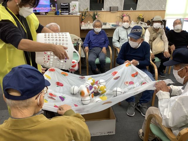 白い玉を落とさないように「そっち側もっと上げて!」「あ~!落ちる落ちる!」など声を掛け合いながら皆様楽しまれておりました。