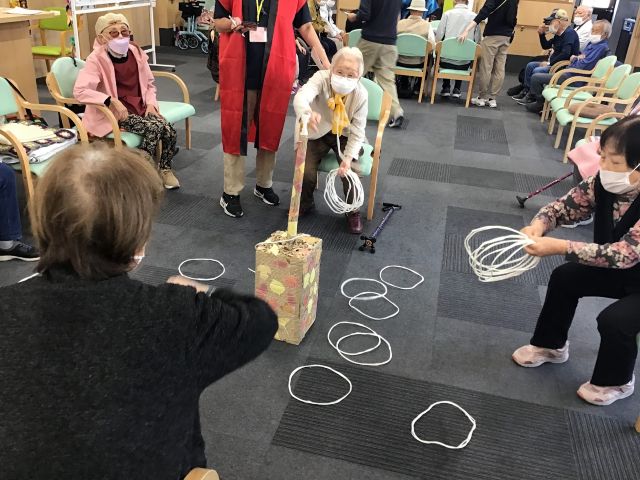 「ミノムシ捕獲チャレンジ」では、1本の的に対して3人のご利用者様がいっせいに輪っかを投げていきます。