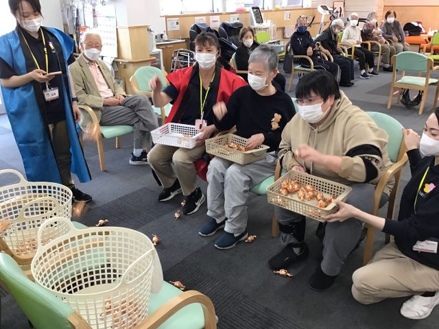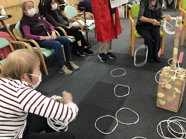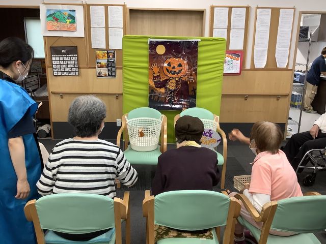 心うきうき祭りは、春・夏・秋・冬と年に4回ケアプラス全センター統一で開催される大型お祭りイベントです。今回の秋の陣では、「トリック・オア・トリート」「ミノムシ捕獲チャレンジ」「秋の大収穫」の3種目を競い合いました。