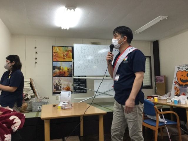 終盤ではカラオケイベントで定着しつつある、顔面白塗りにした職員が登場しました。ご利用者様は大笑いで記念撮影も行いましたが、この日はなんと所長も白塗りで登場したため、ご利用者様だけでなく職員までもが驚いていました。所長はというと…全員の驚きを気にする素振りもなく、しっとりとバラードを歌い上げました(笑)。顔と選曲のギャップが面白く、沢山の笑顔が溢れ良い思い出ができたことと思います。