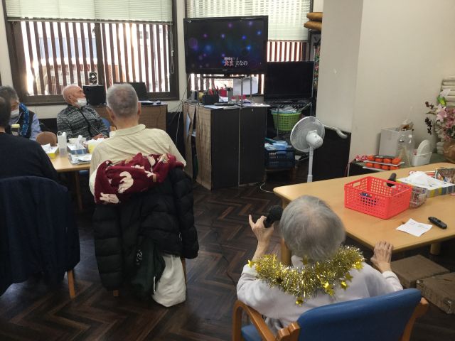 その後は、いつもカラオケの時間にリクエストはいただくものの、リハビリであったりお風呂であったりと、なかなかカラオケに参加できない職員も参戦し盛り上げます。