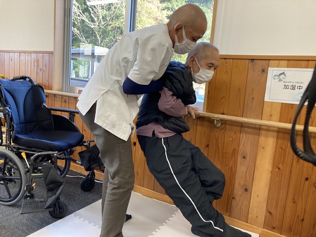 床からの立ち上がりでは、自宅にも横手すりがあるため、横手すりを把持して立ち上がりを実施しています。こちらも立ち上がりの訓練を反復して実施することで、軽介助にて床からの立ち上がりが可能となりました。※(写真2)