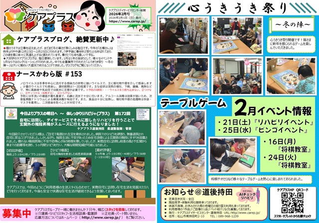 さて、この度のケアプラス道後持田新聞 2026年2月号では、「心うきうき祭り~冬の陣~」「テーブルゲーム」についてご紹介させていただいております。