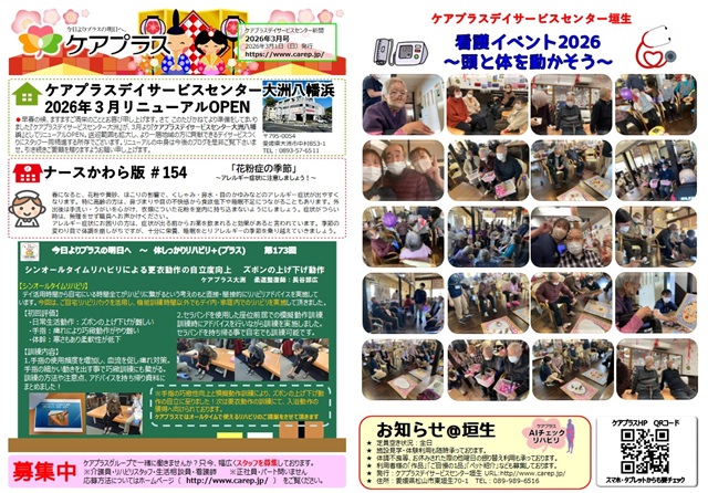 ケアプラス垣生新聞3月号では、ビンゴ大会や看護イベントやお菓子イベントの様子など紹介しております。参加された皆様の写真を掲載しておりますので、是非ご覧ください!