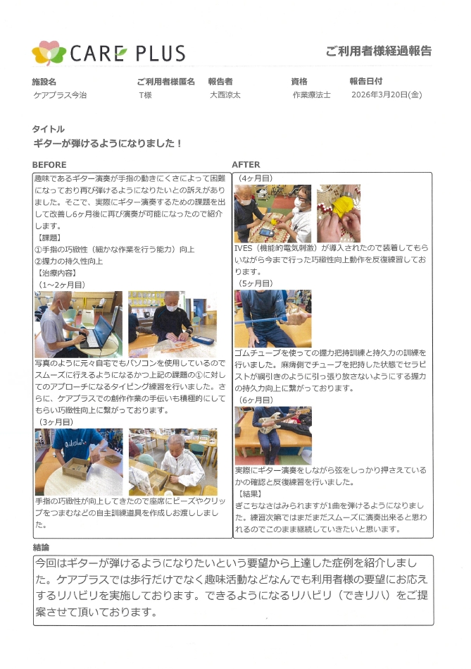 4月号のリハビリNEWSは、さまざまな上肢機能訓練を行い手指機能が向上しギター演奏ができるようになった事例です。