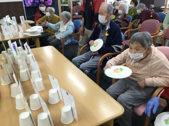 これは2年前に登場したゲームですが、ご利用者様のアンコールにお応えし、今年も実施となりました。春の花の的へ向け、フリスビーを投げ倒していくゲームです。