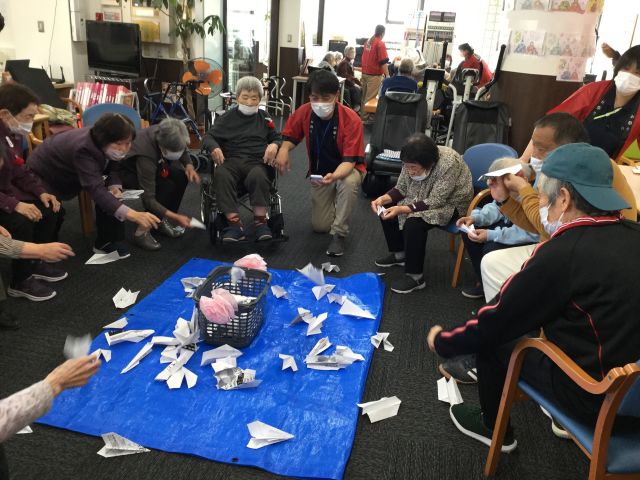 さて、ここからが本番で、時間内に折った紙飛行機を中央に広げられたブルーシートめがけて飛ばします。