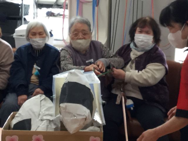 こちらも2人1組で花見用の巨大おにぎり弁当を作ります。巨大おにぎりを手製の巨大トングで挟み、弁当箱に見立てた箱に入れていきます。二人で呼吸を合わせないとトングが上手く操作できない為、四苦八苦です。「いくで~!!」「こりゃ重いわい!!」と様々な声が聞こえてきましたが、成功すると手を叩いて喜んでおられ、一番盛り上がった種目となりました。