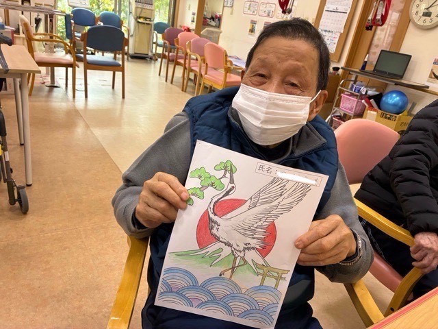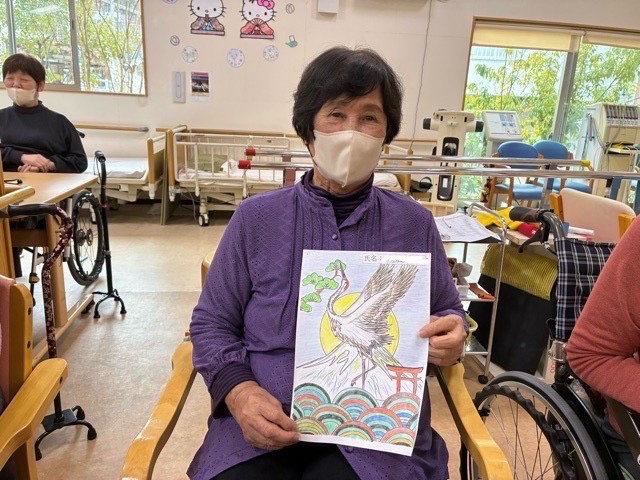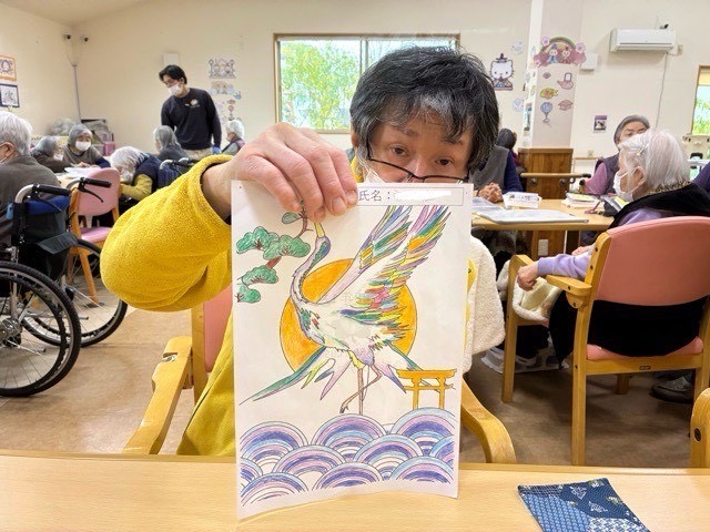 午前の創作レクの一部として塗り絵を取り入れています。鉛筆を「掴む、握る、動かす」動作が手指の巧緻性を高め麻痺のリハビリや指先訓練になります。また、自律神経を整えストレス発散だけでなく脳全体を活性化させ認知症予防や改善にも効果的です。