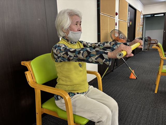 このようにケアプラスにて様々な機器を使って運動しつつ、お休みにてご自宅で過ごされる際には棒を使って体操していただくなど、様々な使い方ができるかと思います。