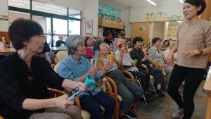 そして、その後はみなさまお待ちかねの歌謡ショーの開始です。日頃めったに歌われない職員も歌うということもあり、ご利用者様は大変楽しみにされていたようで、職員が歌い始めると、「頑張ってー‼」と声を掛けてくださったり、タンバリンやカスタネットなどの楽器を鳴らして応援してくださいました。