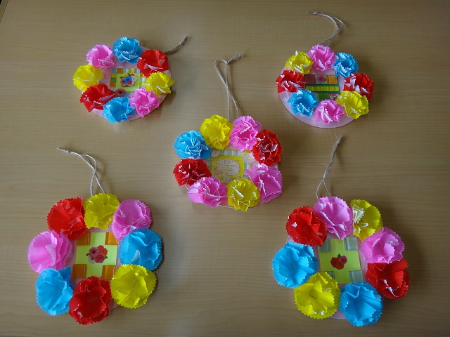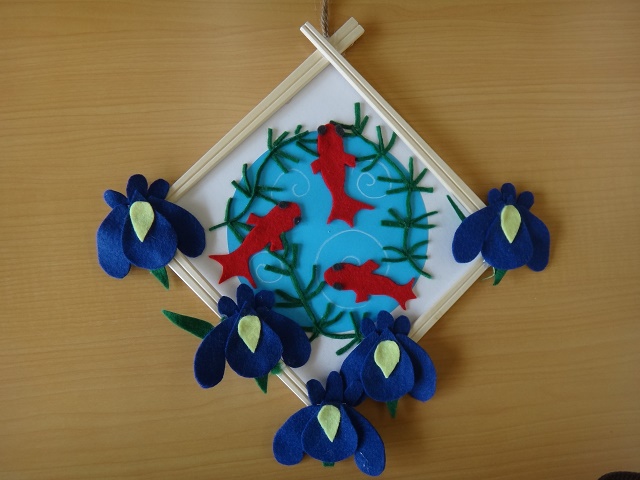持田でも夏らしい作品が出来上がりました。まずは、日曜日の割りばしで枠を作った金魚の飾り。