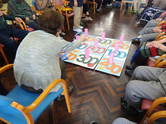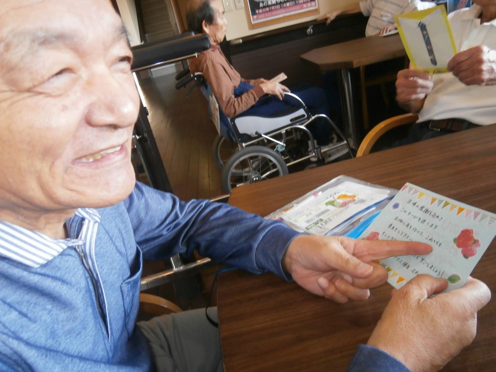マイクを向けられ恥ずかしそうにされるご利用者。手拍子されて楽しんでおられる方。皆様楽しんでいただけたようです♪