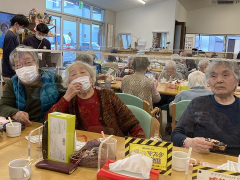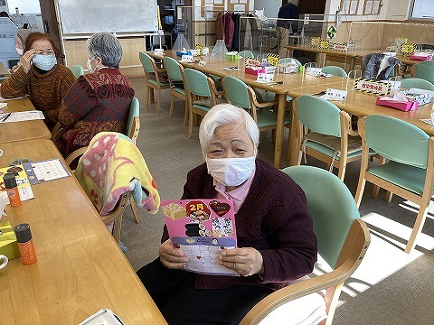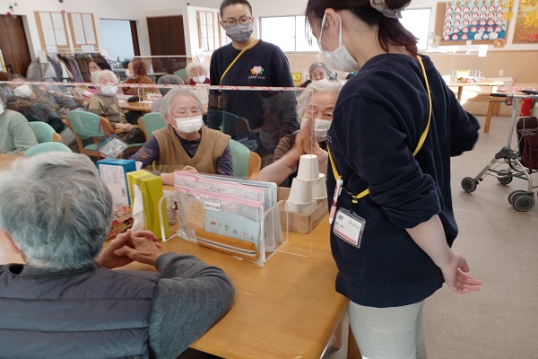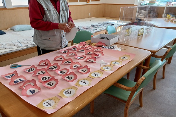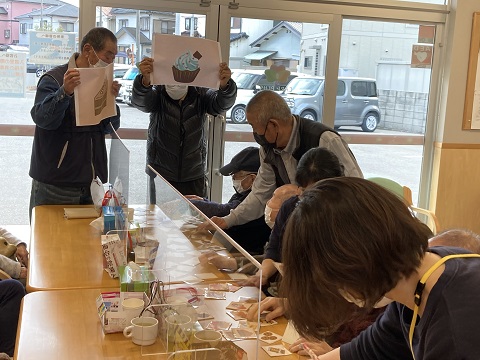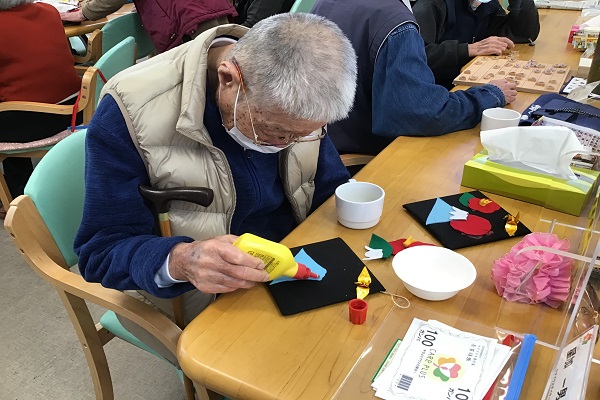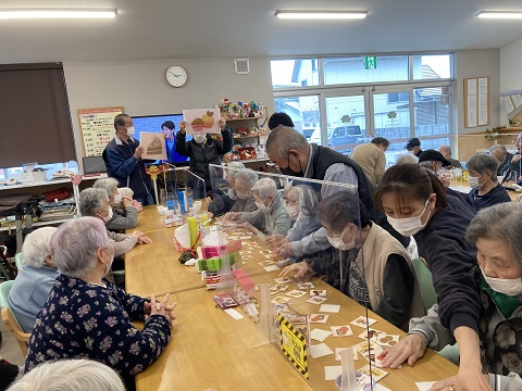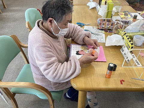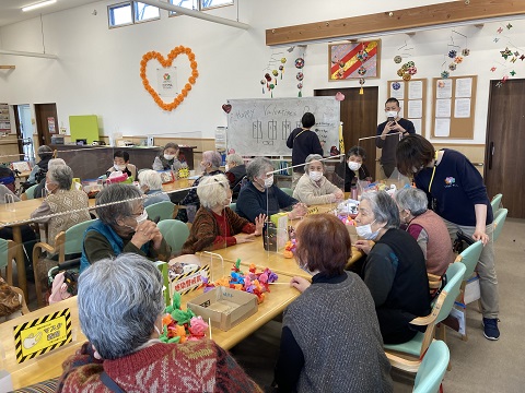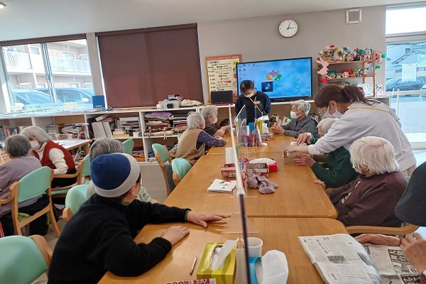 ご利用者様が、準備の段階から手伝ってくださり、賑やかな飾りつけになりました。今回のイベントの内容はひなまつりに関するクイズを行いました。